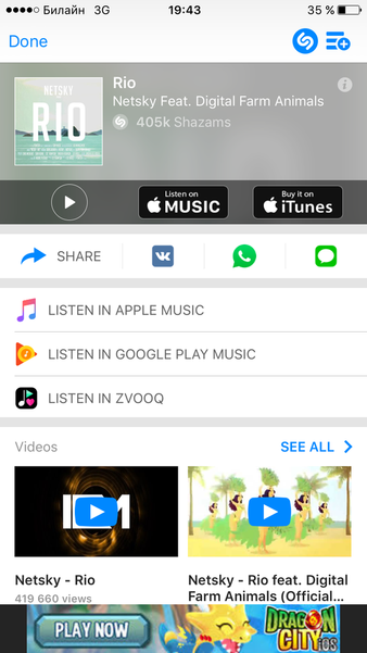 Если у вас есть ролик, в котором играет интересующая вас композиция, запускайте его и жмите на большую кнопку в Shazam. Буквально через несколько секунд приложение распознает песню, покажет название, исполнителя, альбомы и сборники, в которые входит песня и даже даст ссылку на официальный клип. Если, конечно, он существует.