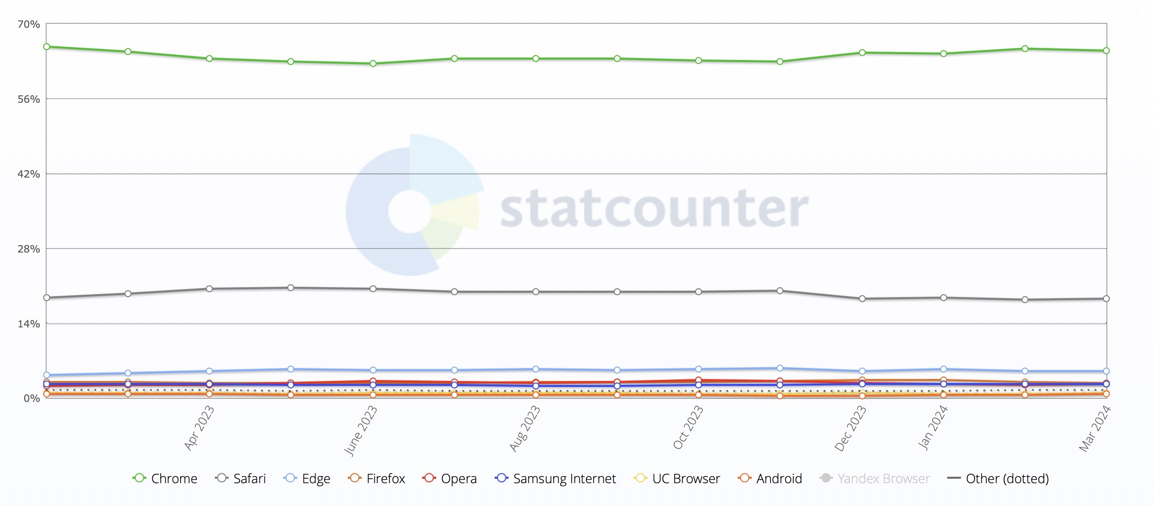 В топах оказался ChromeАналитическая компания Statcounter выкатила инфографику, в которой привела рейтинг самых популярных браузеров для ПК и смартфонов на март 2024 года.