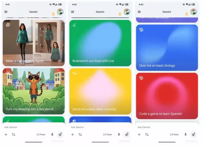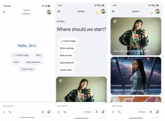 Обновления заметили в последней версии приложения для Android. Реверс-инженер включил новый главный экран, где кнопки вроде «Создать изображение» или «Глубокое исследование» теперь расположены сверху, а ниже идёт прокручиваемая лента с предложениями. Примеры промтов включают идеи вроде «Перенеси меня в глубокий космос», «Сделай фото винтажным» или «Преврати мой рисунок в книгу». Другие подсказки предлагают использовать Gemini для мозгового штурма или ежедневной подборки новостей.