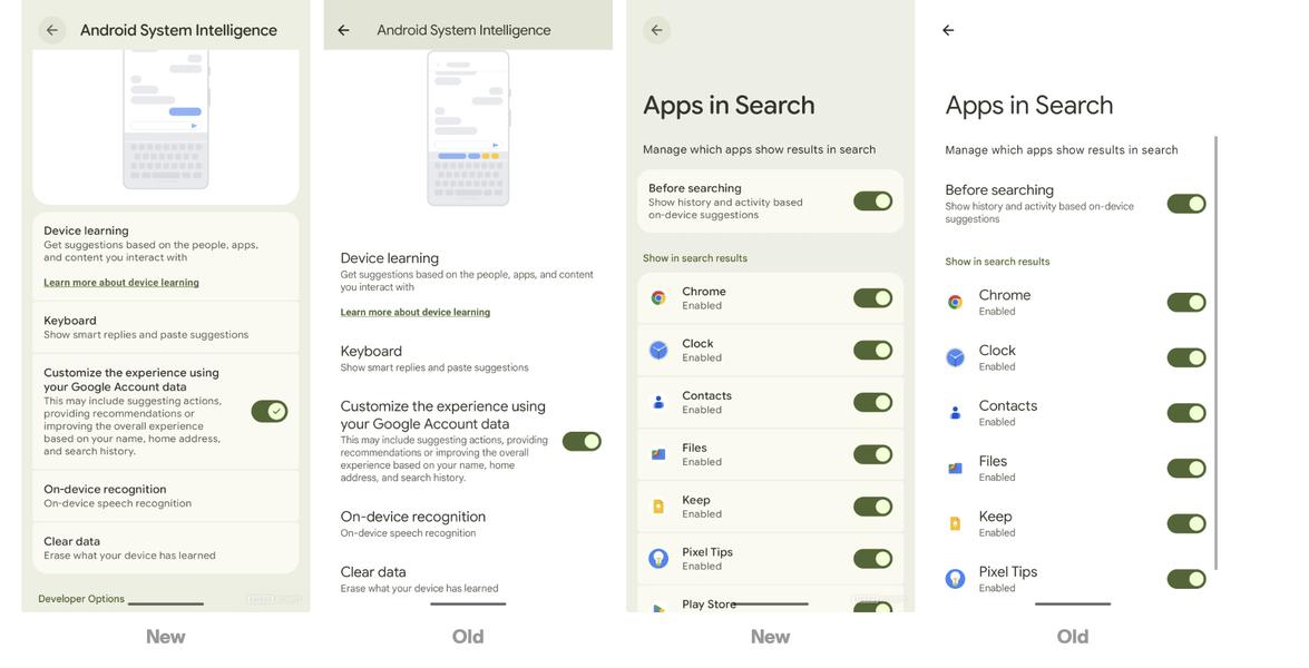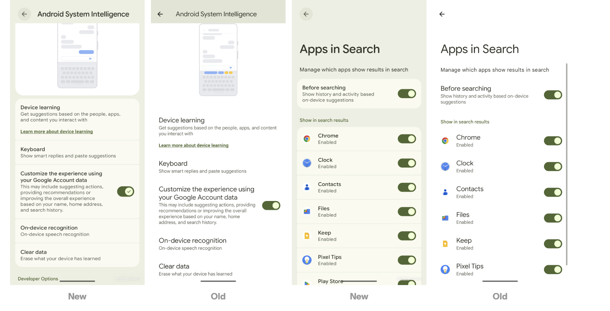 На страницах «Сейчас воспроизводится», «Выразительные субтитры» и Android System Intelligence обновлена графика. На странице «Краткий обзор» разработчики внедрили новое описание функций. Переключатели стали отличаться: на некоторых страницах при включении высвечивается галочка, на других — крестик.
