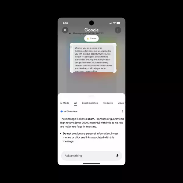 Кроме того, функция Circle to Search позволяет выделять подозрительные сообщения, чтобы проверить, являются ли они мошенническими. В ИИ-обзоре для подтверждения выводов будет использоваться информация из Сети. Например, в сводке от Gemini может быть указано, что «гарантированная высокая доходность» часто указывает на потенциальное мошенничество, и пользователю может быть рекомендовано не делиться личной информацией, не вкладывать деньги и не переходить по каким-либо ссылкам, связанным с сообщением.