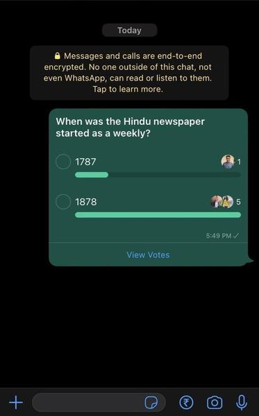 Теперь в мессенджере можно создавать опросы. Причём доступны они вообще в любых чатах, в том числе в индивидуальных и групповых. Чтобы воспользоваться новой функцией, нужно нажать на значок «+» и выбрать опцию «Опрос».