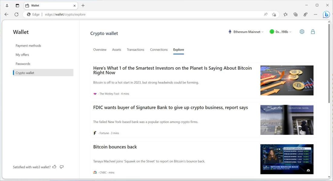 Согласно скриншотам, криптокошелек встроен в Edge, так что вам не понадобятся никакие дополнительные браузерные расширения. Он также способен работать с несколькими типами криптовалют, а также заносить в логи транзакции и стоимость отдельных валют по мере их колебания. На вкладке "explore" расположились новости, связанные с криптовалютами, а вкладка "assets" сохранит ваши NFT.