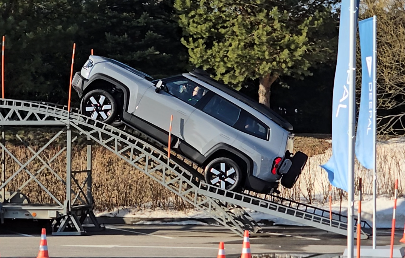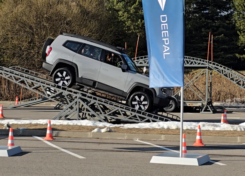 Также я опробовал машину на грунтовых дорогах и на полосе препятствий, включающей в себя "качели", диагональное вывешивание, подъём в горку с углом 23 затем 45 градусов. Машина прекрасно справилась с этими условиями, а благодаря тому, что колёса приводит во вращение электродвигатель, даже заезд в горку не повышает общий уровень шума. Впрочем, Deepal G318 имеет и звукоизоляцию — двойные стёкла (а ещё тут очень крутая акустика внутри салона).