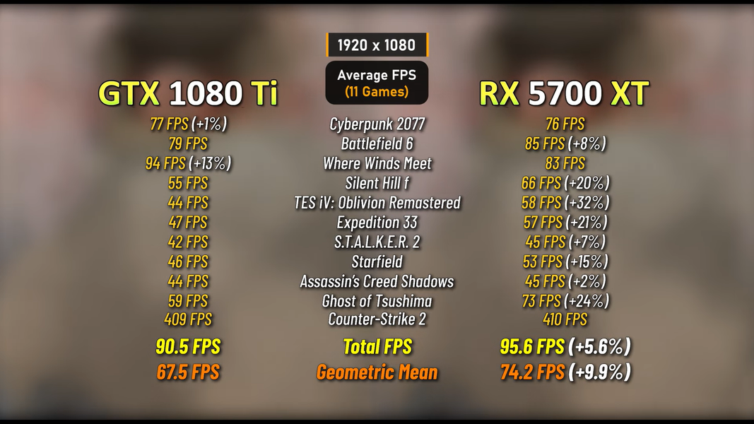 Разница между ними равнялась 10%Тестовый стенд включал процессор Ryzen 5 7600X, матплату MSI PRO X670-P WIFI (AGESA 1.2.0.3g), оперативную память 2x16GB DDR5 6000 CL28, систему охлаждения MSI Coreliquid S360, накопитель Samsung 980 Pro 1TB, WD Blue SN570 2TB (x2), блок питания Corsair RM1000X, операционную систему Windows 11 Pro 24H2 (Build 26100.7462), видеокарты ASUS GTX 1080 Ti 11GB GDDR5X STRIX OC и ASUS RX 5700 XT 8GB GDDR6 TUF OC.