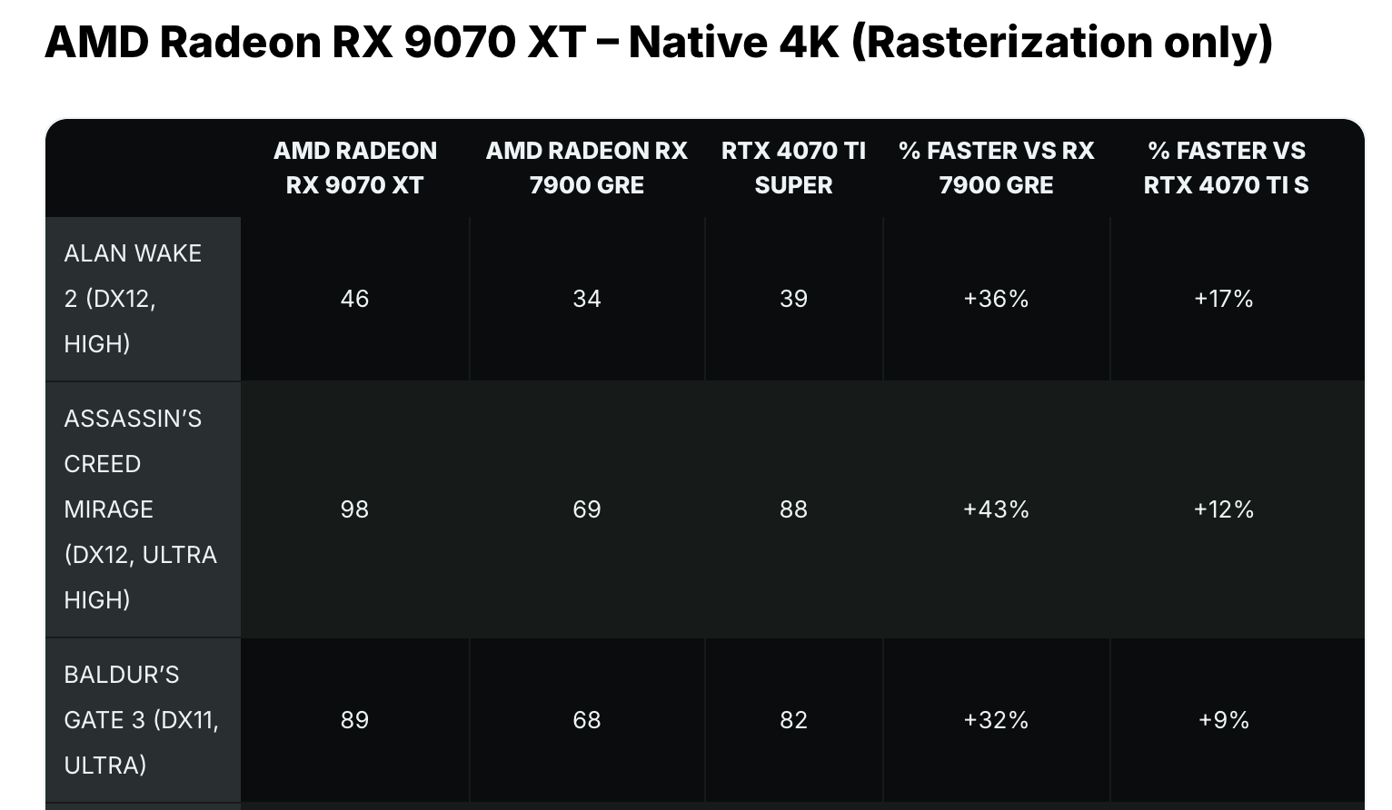 Впечатляющие результатыВ 4K RX 9070 XT оказался на 36% быстрее RX 7900 GRE и обогнал RTX 4070 Ti SUPER на 12%. Младшая модель RX 9070 также показала достойные результаты, превзойдя 7900 GRE на 15% и RTX 4070 SUPER на 17%.