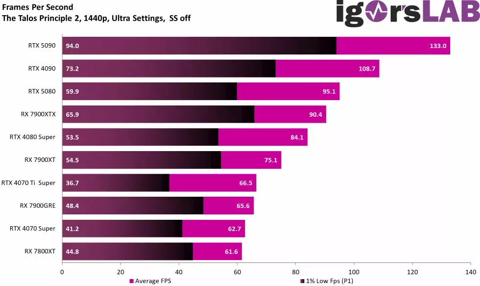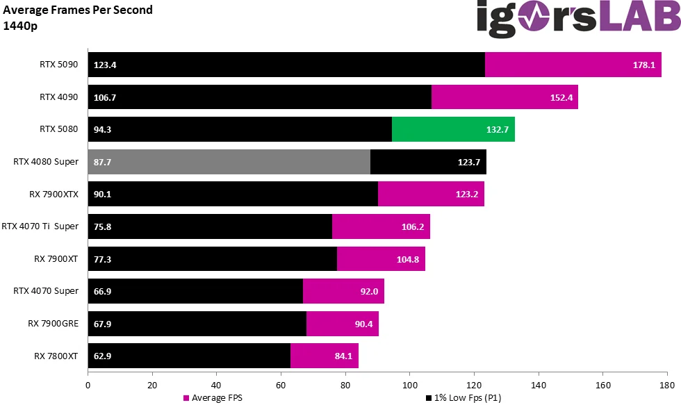 Согласно опубликованным данным от Igor’sLAB, RTX 5080 в среднем всего на 8.3% быстрее RTX 4080 SUPER при разрешении 1440p без трассировки лучей и апскейлинга.