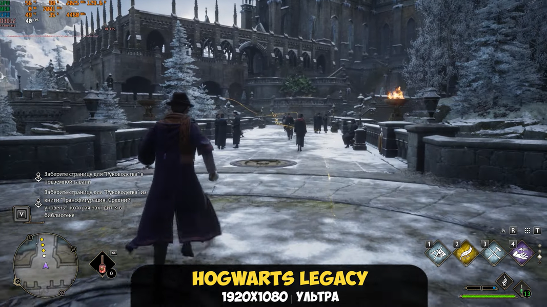 Hogwarts Legacy с ультра-пресетом шла со средним FPS на уровне. Но иногда это число снижалось до 30 к/с. При переключении на FSR2 Quality удалось получить более 60 к/с.