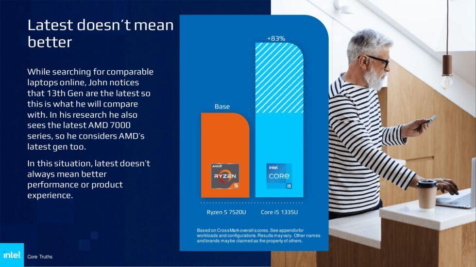 Не самый прорывной продукт компания сделалаНо подождите, Intel, прежде чем играть в «полицию нравов», стоит присмотреться к себе. Ars Technica подметила, что Intel умалчивает о своей собственной истории «переупаковки» старых технологий. Порицая Ryzen 5 7520U, Intel не замечает, что ее собственный i5-1335U не является революционным скачком и имеет поразительное сходство со своим собратом 12-го поколения, пишет издание.