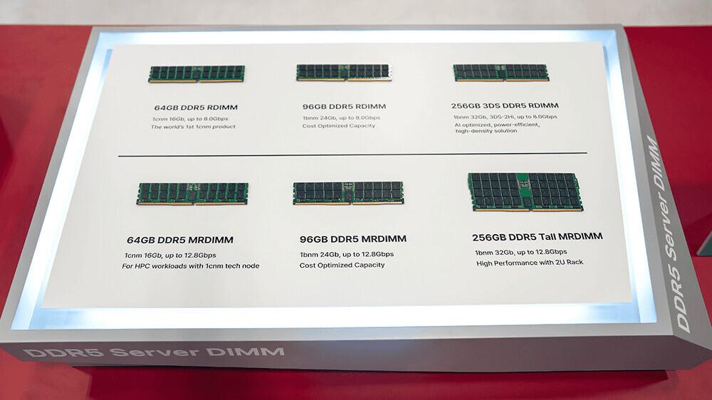В области DRAM были показаны модули DDR5 для серверов следующего поколения, способные работать быстрее и потреблять меньше энергии. Среди них — решения объёмом 256 ГБ.