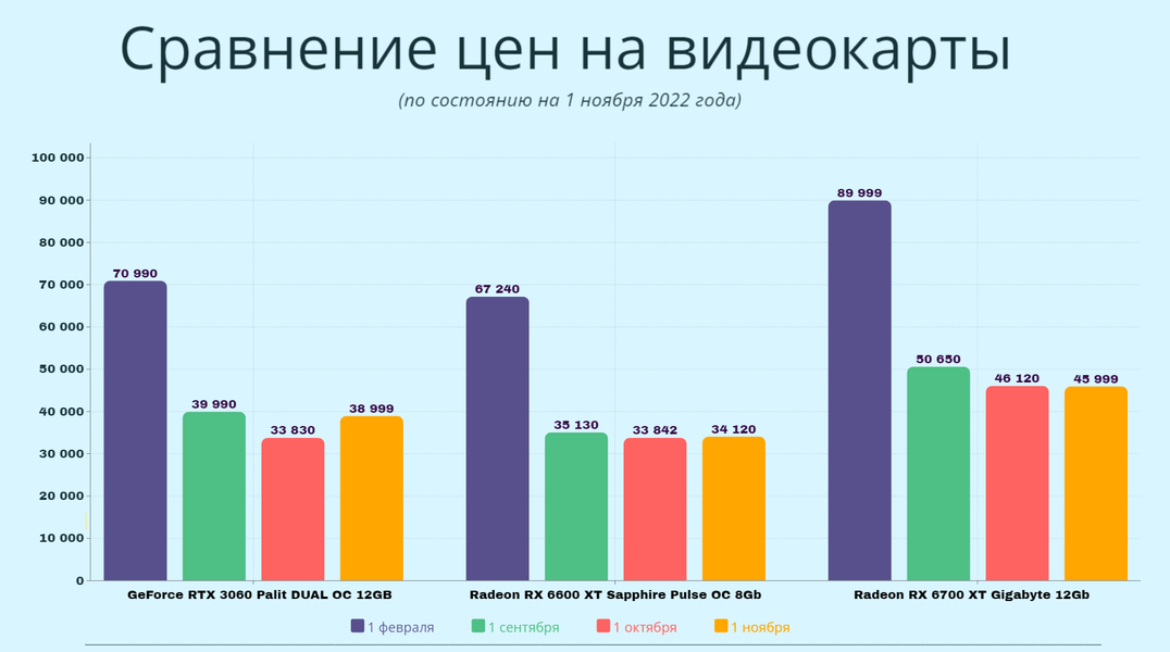 А также рост цен на видеокартыDTF опубликовал графики сравнения цен на компьютерные комплектующие в период с 1 февраля по 1 ноября 2022 года. Есть хорошие новости: стоимость некоторых товаров стала падать.