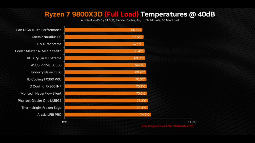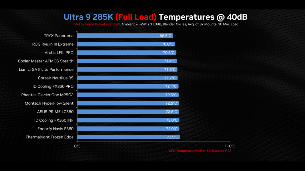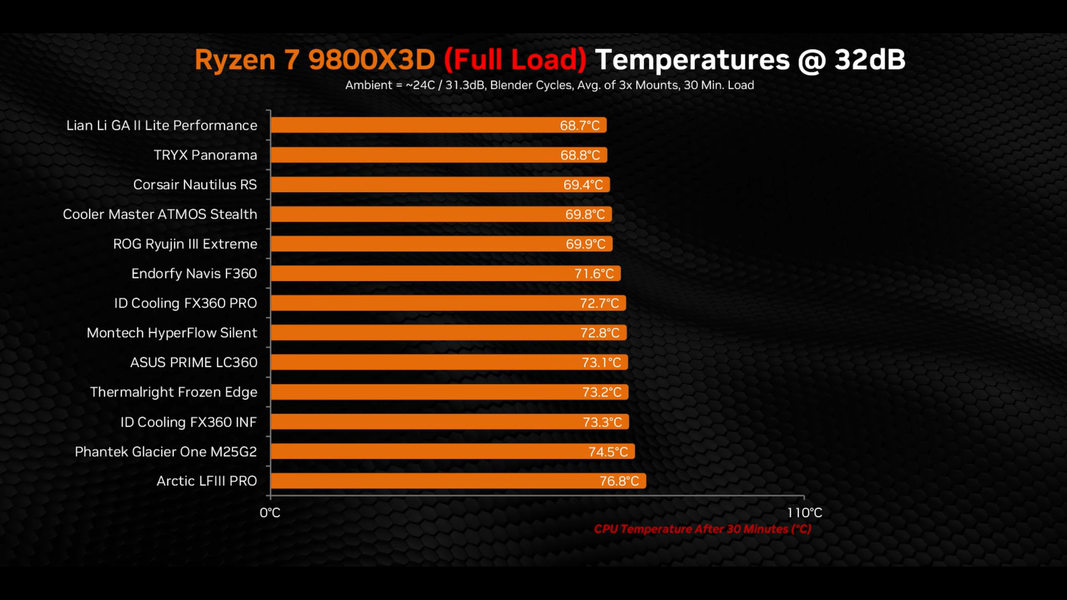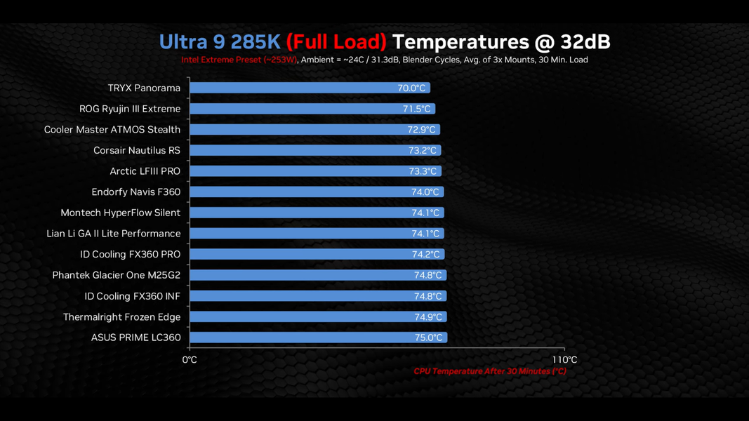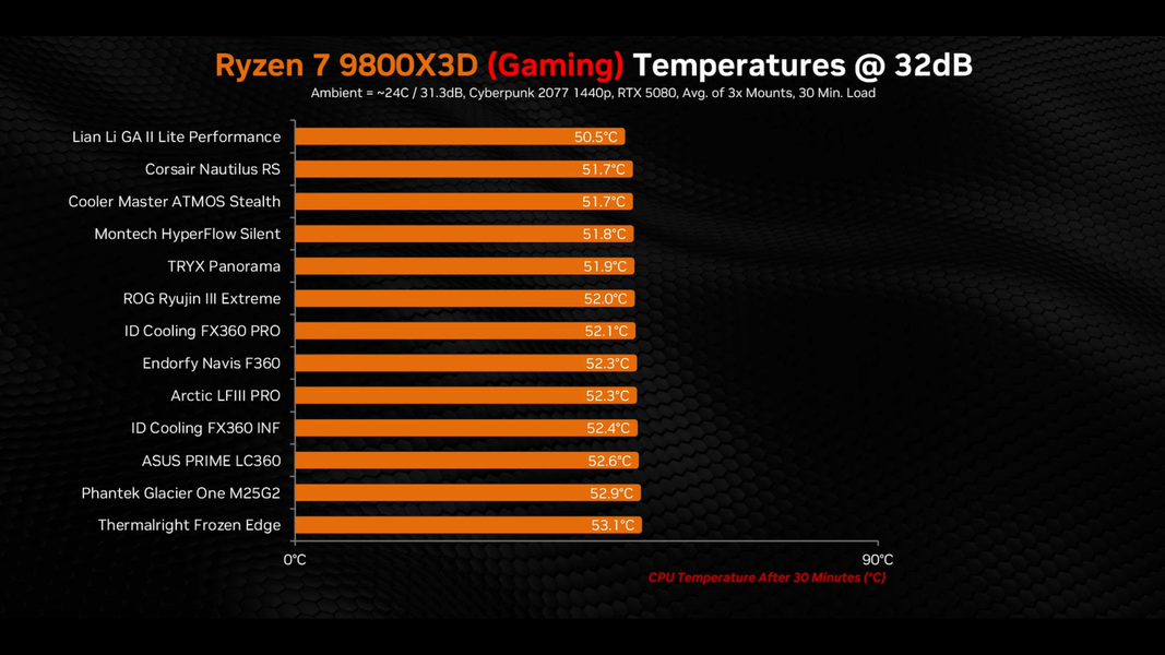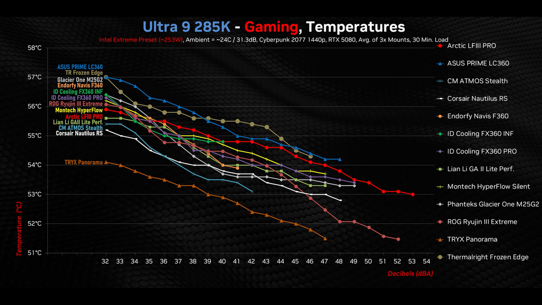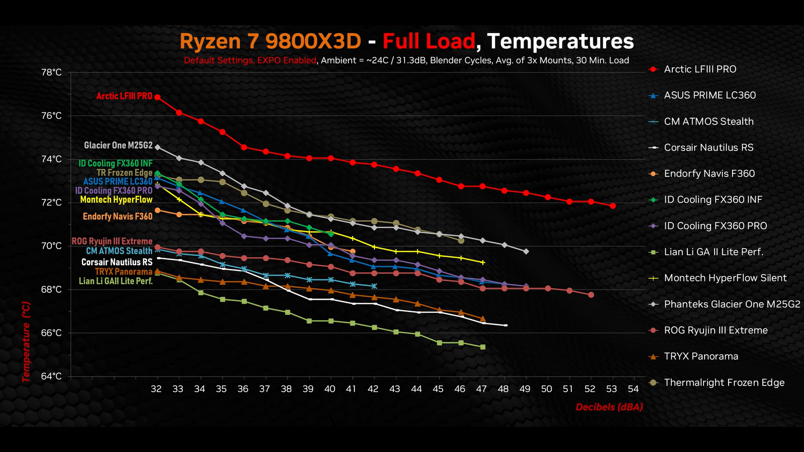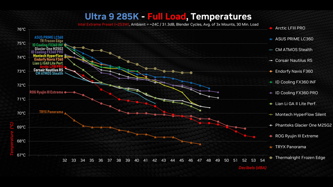 Всего участвовали в эксперименте 13 моделей СЖО. Это Lian Li Galahad 2 Lite Performance, TRYX Panorama, Corsair Nautilus RS, Cooler Master Atmos Stealth, ROG Ryujin III Extreme, Endorfy Navis F360, ID Cooling FX360 PRO, ID Cooling FX360 INF, Montech HyperFlow Silent, ASUS PRIME LC360, Thermalright Frozen Edge, Phanteks Glacier One M25G2, Arctic Liquid Freezer III PRO. С их результатами вы можете ознакомиться на графиках ниже.