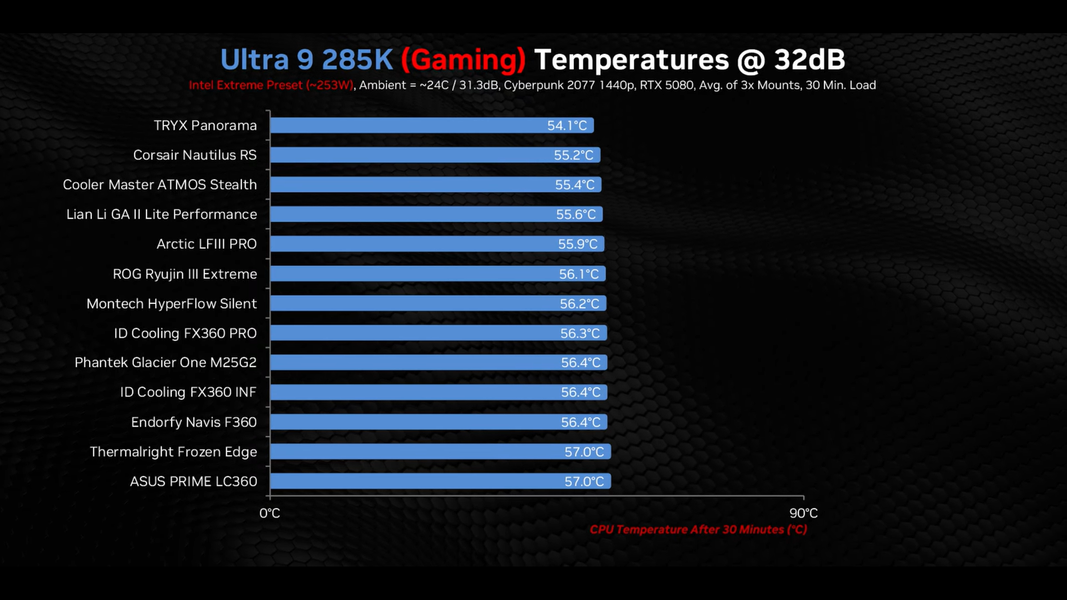 Правда, из продающихся в странах Запада, в России чуть другой ассортиментТестовый стенд включал, помимо систем охлаждения, процессор Ryzen 7 9800X3D (Optimized Defaults)/Core Ultra 9 285K (Extreme Preset), оперативную память EXPO DDR5-6000/XMP DDR5-6000, видеокарту Palit RTX 5080 Gaming Pro, матплату MSI X870E Carbon WiFi/Aorus Z890 Pro Ice, корпус Corsair Frame 4000D.