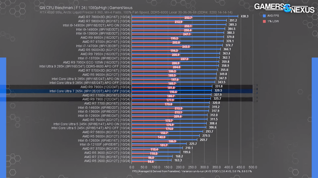 В таких играх, как Dragon's Dogma 2 и F1 2024, Core Ultra 7 265K уступает не только своему конкуренту AMD Ryzen 7800X3D, но и предшественникам в линейке Intel, включая Core i7-13700K и Core i7-14700K.