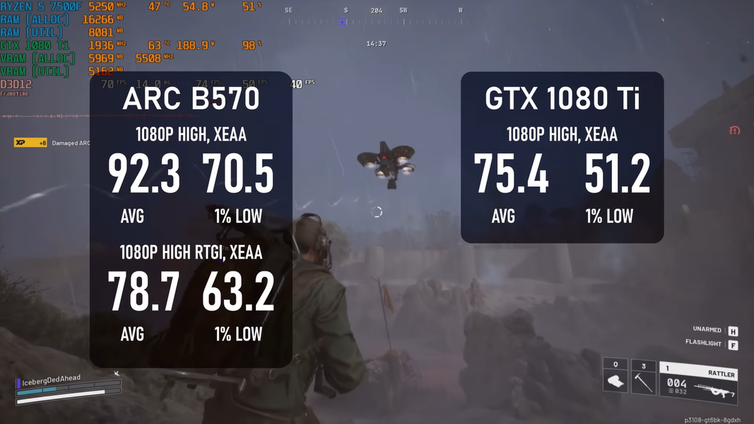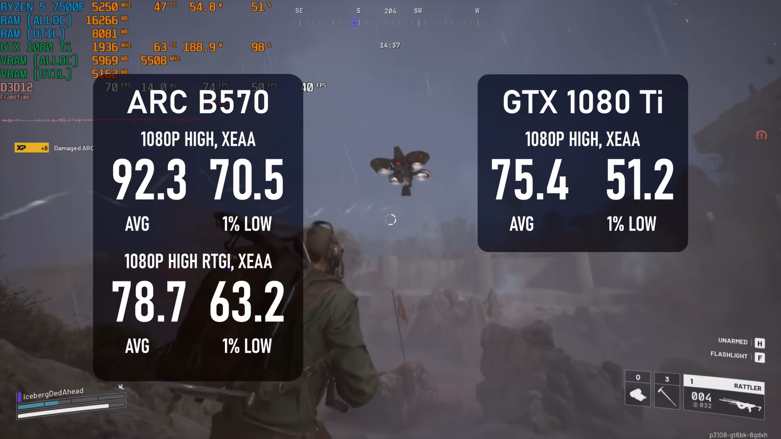 В Arc Raiders с высоким пресетом, XEAA и в 1080р средняя частота кадров с B570 составляла 92 к/с, а с High RTGI - около 79 к/с. Что касается 1080 Ti, то она выдавала на высоких настройках с XEAA 75 к/с.