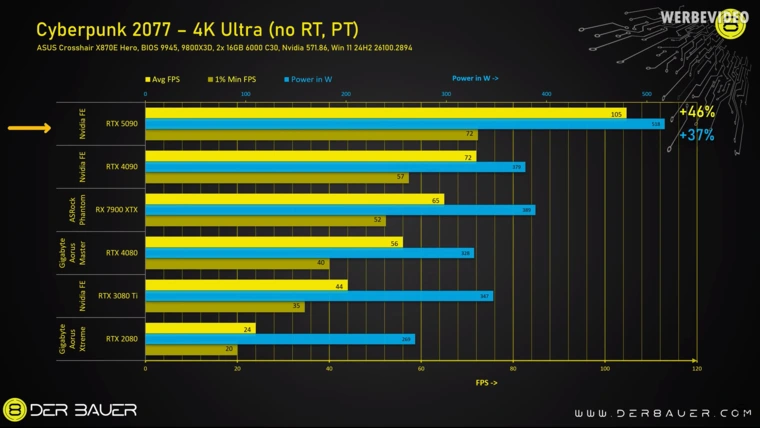 В Cyberpunk 2077 RTX 5090 быстрее на 46%, но потребляет на 37% больше энергии. В Assassin's Creed Mirage разница всего 18%, а в PUBG – 16%, при этом энергопотребление выросло на 30% и 29% соответственно.