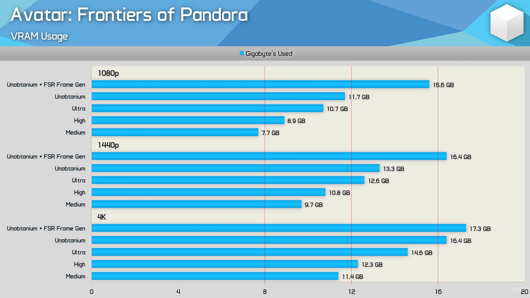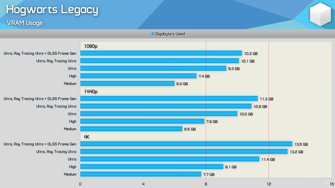 Например, Hogwarts Legacy, вышедшая еще в 2023 году, требует 9,3 ГБ VRAM на ультра в 1080p, а с трассировкой — уже 10,1 ГБ. Avatar: Frontiers of Pandora использует 8,9 ГБ на высоких и до 11,7 ГБ на максимальных настройках.