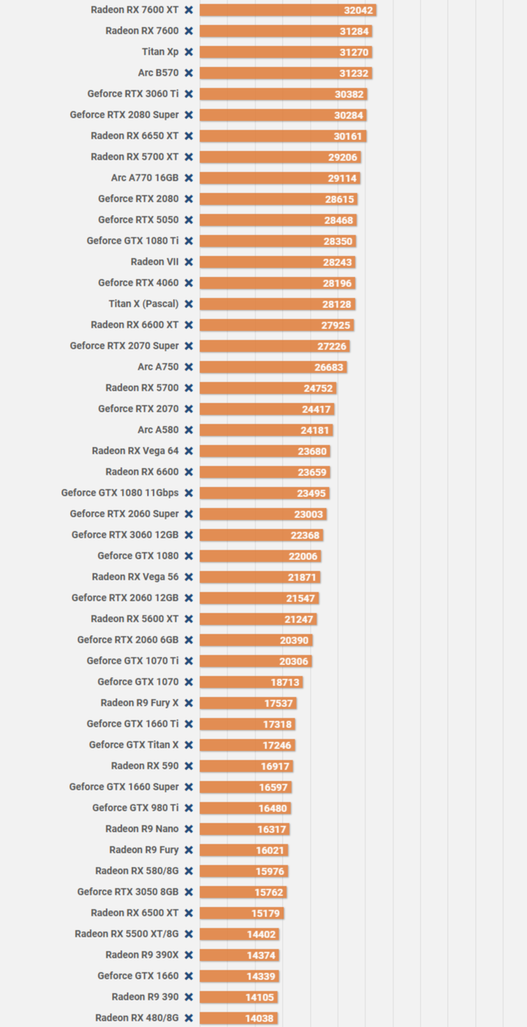 В игровых тестах лидер рейтинга показал результат примерно в 240 раз выше, чем видеокарта в самом низу списка. Для сравнения, актуальная RTX 5090 обеспечивает в 10 раз больше кадров в секунду, чем легендарный GTX Titan.
