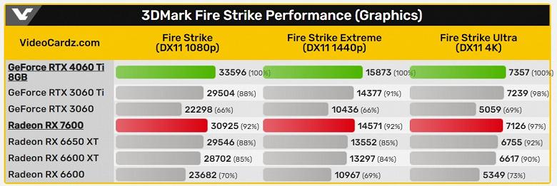 В тесте 3DMark Fire Strike (DX11 1080p), RTX 4060 Ti показала результат в 33596 баллов. Это на 14% больше, чем у RTX 3060 Ti (29504 балла) и на 50% больше, чем у RTX 3060 (22298 баллов).
