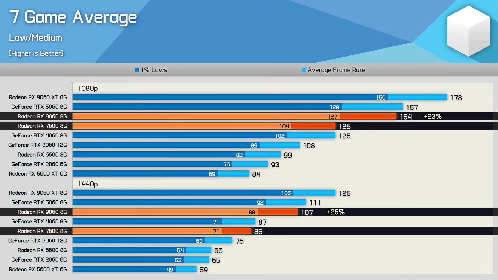 В пресетах Low и Medium RX 9060 показала прирост 23–26% относительно RX 7600, но уступила RX 9060 XT примерно на 13–14%. В сравнении с RTX 5060 разница составила 3–4% в пользу NVIDIA.