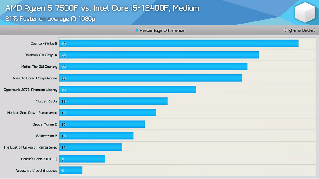 Ryzen 7500F оказался на 30% мощнее Core i5-12400F в тесте в 12 играх