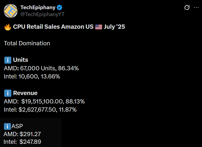 Красные шагают по планетеСогласно свежей статистике от TechEpiphany за июль 2025 года, 86,34% всех продаж CPU на американском Amazon пришлись на AMD, а её доля в выручке составила впечатляющие 88,13%.