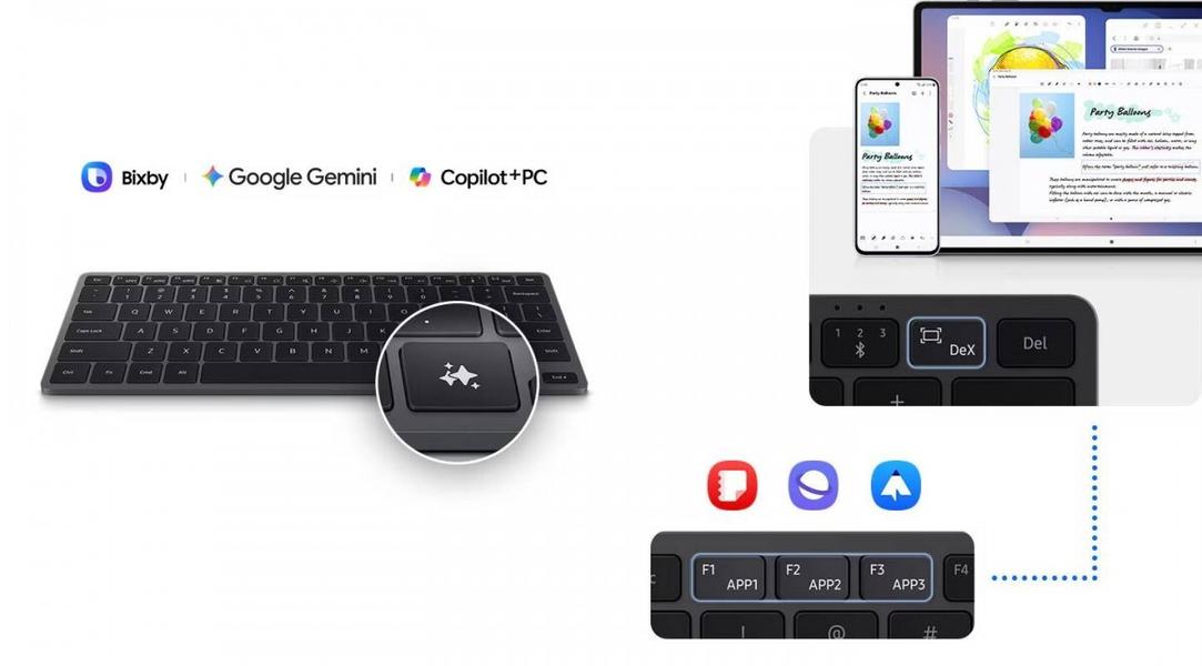 На клавиатуре есть отдельная кнопка DeX (технология, позволяющая превратить смартфон или планшет Samsung в подобие ПК), клавиши F1–F3 можно настроить как ярлыки приложений. Кроме того, есть кнопка ИИ: на Android она запускает Bixby или Google Gemini, на Windows — Microsoft Copilot.