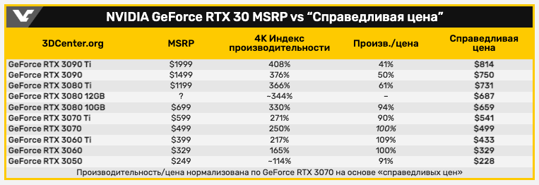 По подсчётам 3DCenter, выбравшего RTX 3070 в качестве точки отсчёта, большинство топовых моделей NVIDIA должны стоить намного дешевле. С видеокартами среднего уровня ситуация чуть лучше. Посмотреть на сравнительные таблицы можно ниже: