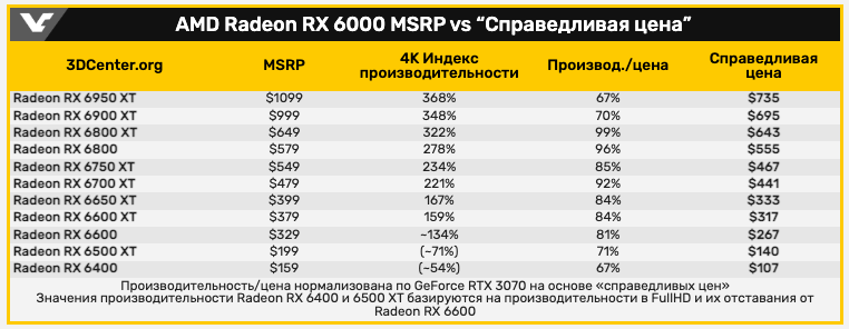 По справедливостиАналитики 3DCenter, которые несколько последних лет делились с нами статистикой стоимости видеокарт, решили сделать таблицу с ценами на GPU, исходя из их производительности. Получились числа, которые должны стоять на ценниках видеокарт «по справедливости».