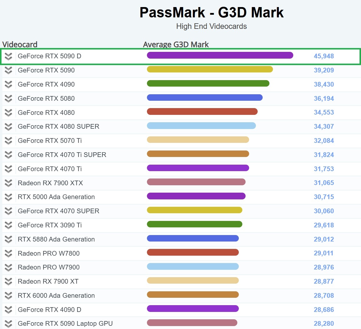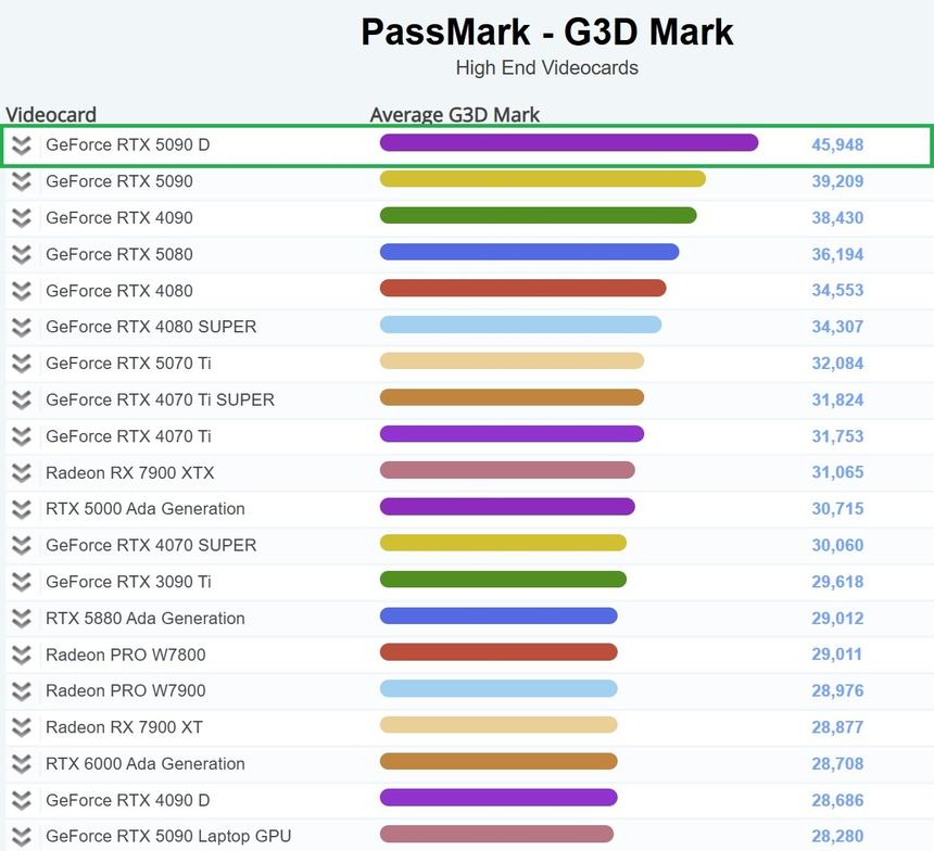«Урезанная» RTX 5090D обогнала не только RTX 4090, но и обычную RTX 5090 в рейтинге PassMark