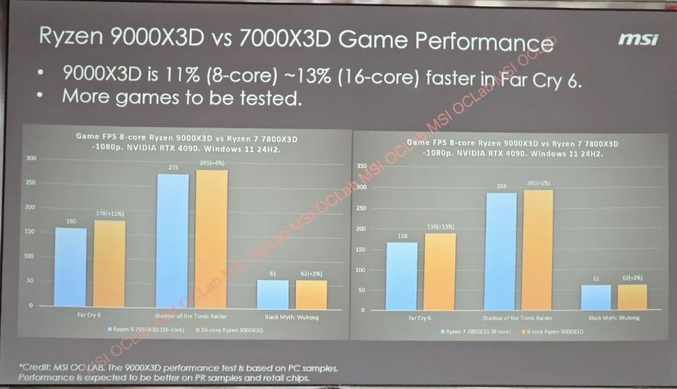 Согласно слайдам из презентации MSI, опубликованной HardwareLuxx, новые чипы показывают неплохой прирост многопоточной производительности — 8-ядерный 9000X3D обгоняет Ryzen 7 7900X3D на 28% в тесте Cinebench R23. Однако прирост производительности в играх, таких как Black Myth: Wukong и Shadow of the Tomb Raider, составляет всего 2%.