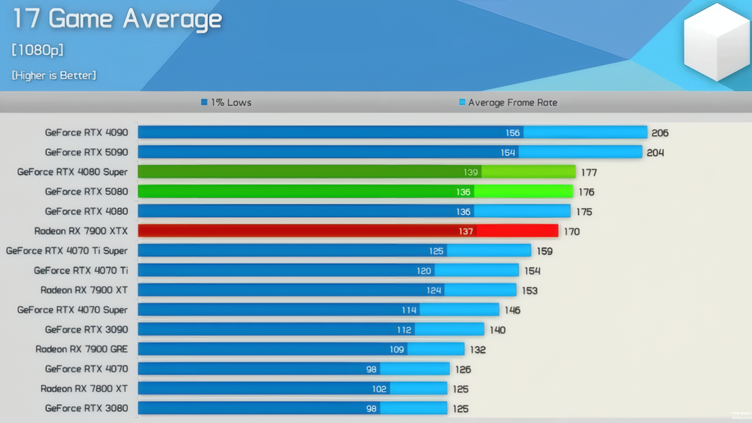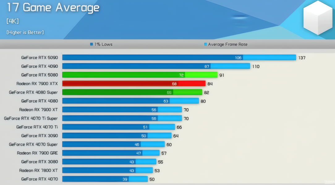 Обозреватели Hardware Unboxed назвали RTX 5080 не чем иным, как RTX 4080 Ti Super, критикуя NVIDIA за слабый прирост производительности. Их вывод — лучше взять RTX 4080 Super и сэкономить, не дожидаясь старта продаж новой карты.