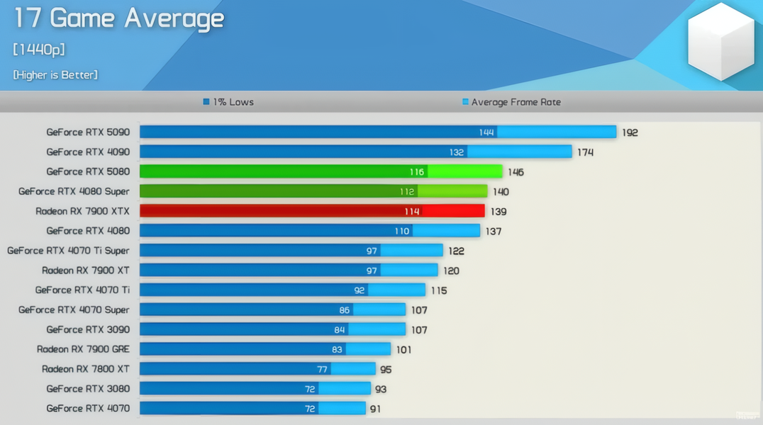 RTX 5080 проверялась в 17 играх на системе с Ryzen 7 9800X3D, сравниваясь с RTX 4080 Super, RTX 4080 и RX 7900 XTX.