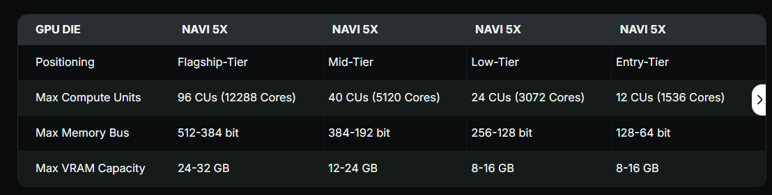 Флагманская модель получит 96 CU и до 12 288 потоковых процессоров, а также до 32 ГБ памяти с шиной 512 бит (или 24 ГБ / 384 бит). По производительности карта должна конкурировать с NVIDIA RTX 6080.