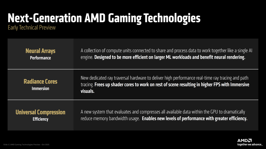 AMD также внедрит новые блоки Neural Arrays и Radiance Cores для ускорения ИИ-вычислений и трассировки лучей, а технология Universal Compression снизит нагрузку на видеопамять.