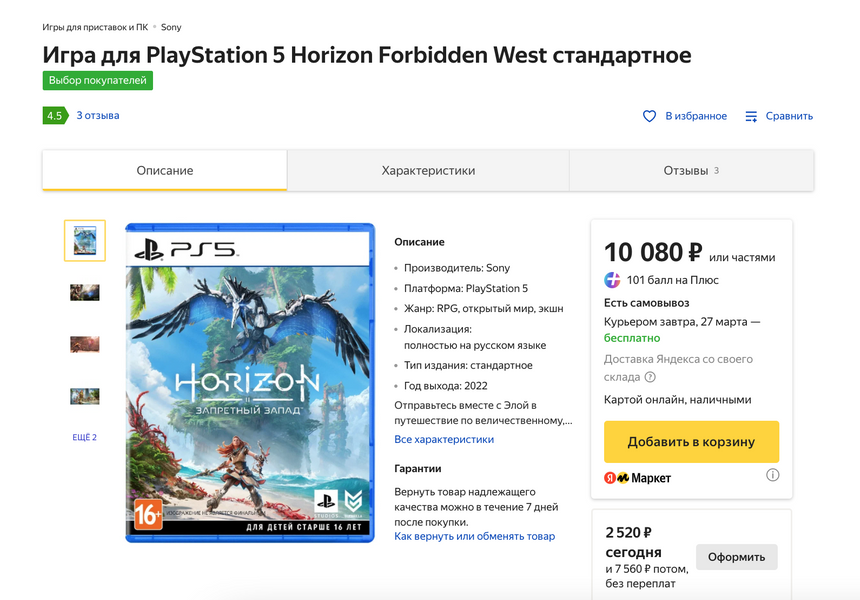 При этом на Яндекс.Маркете удалось найти стандартное издание Horizon Forbidden West для PS5 за 10080 рублей. С чем связана такая цена, неизвестно.
