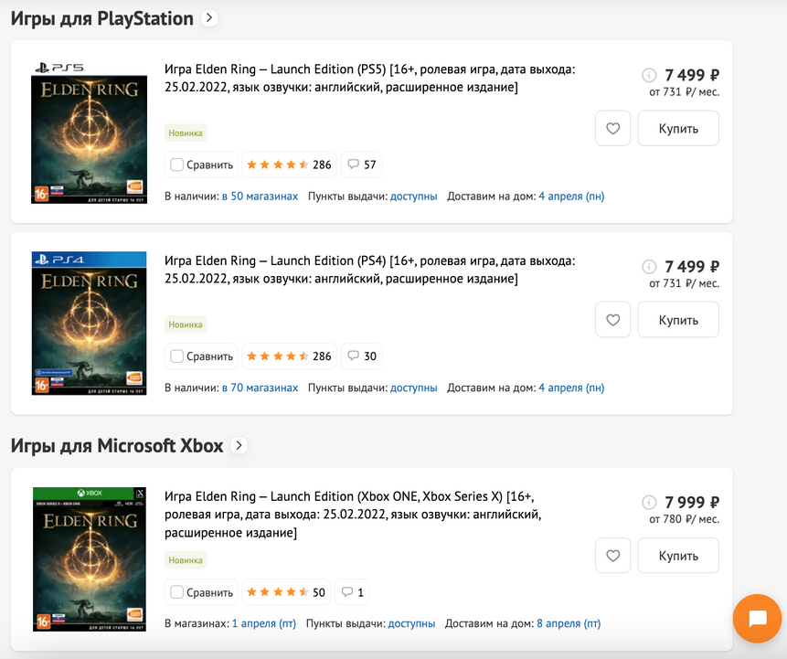 Недавний хит Elden Ring продают за 7499 рублей для консолей Sony, а также за 7999 рублей для Xbox.