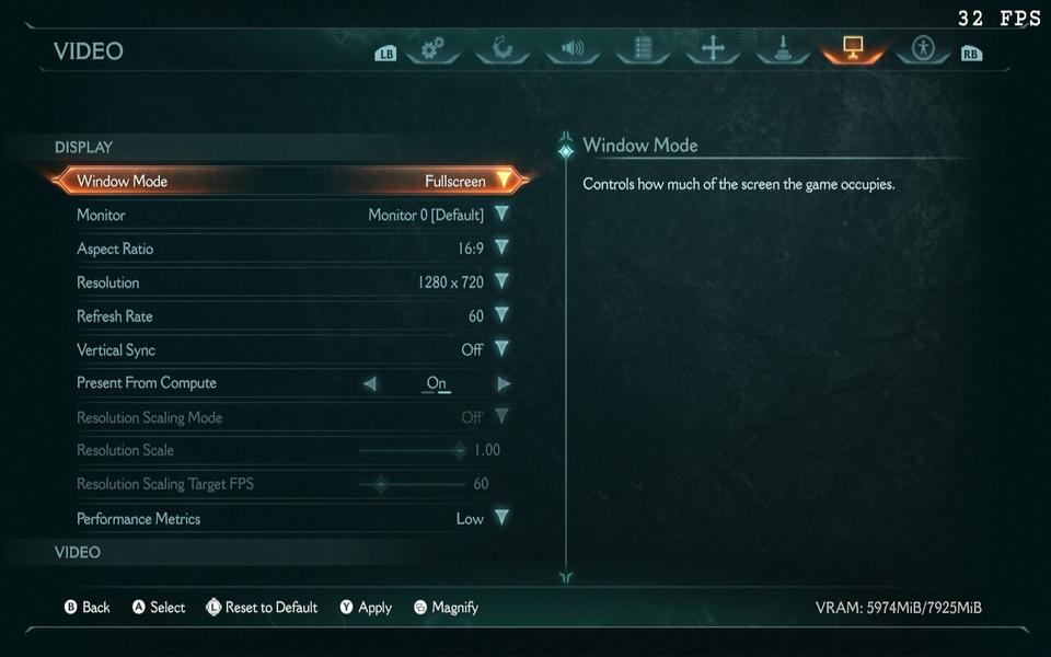При разрешении 1280 × 720, отключенных Depth of Field и Chromatic Aberration и включенном FSR Quality, игра в большинстве сцен держит стабильные 30 fps. Иногда частота кадров поднимается до 42 fps, если поблизости мало врагов и текстур, но в массовых сражениях с десятками монстров она падает до 20 fps.