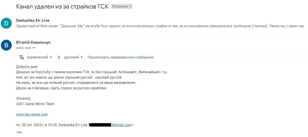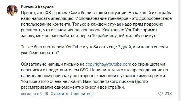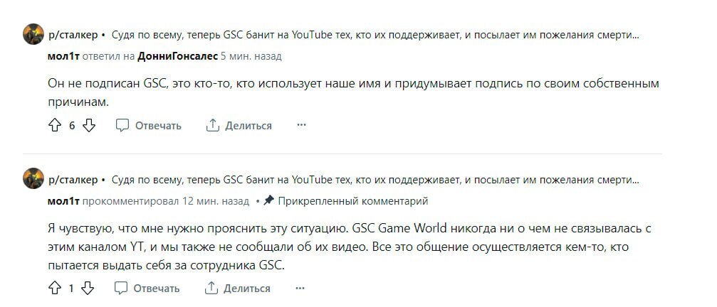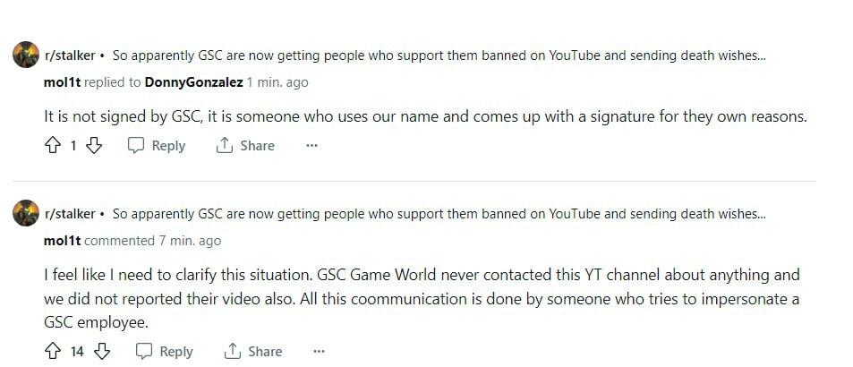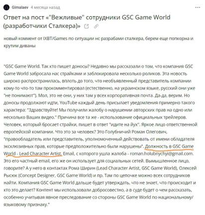 При этом, что интересно, разработчики проекта пришли в комментарии на Reddit. Коммьюнити-менеджер GSC под ником mol1t заявил, что компания никогда не общались с YouTube-каналом, который получил русофобское письмо. Более того, он отрицает какие-либо репорты, отправленные против него из-за видео. и никогда не репортила видео. Однако все опровергается скриншотами, на которых ранее были замечены все те же email-адреса, что и в переписке с заблокированным ютуб-каналом блогера. А по никам и можно распознать и их место работы — GSC Game World:
