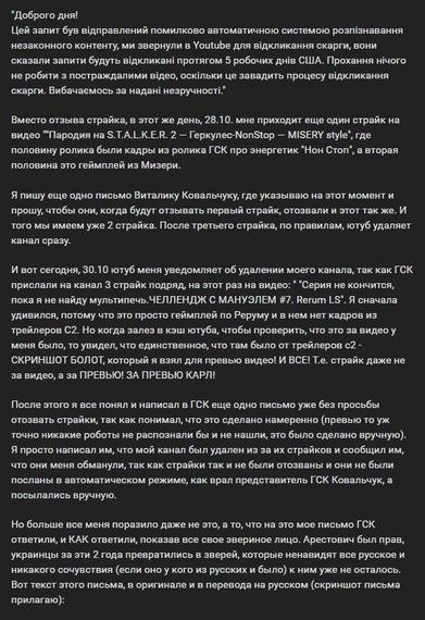 Разработчики S.T.A.L.K.E.R. пожелали русским смерти и начали блокировать блогеров из РФ на YouTube
