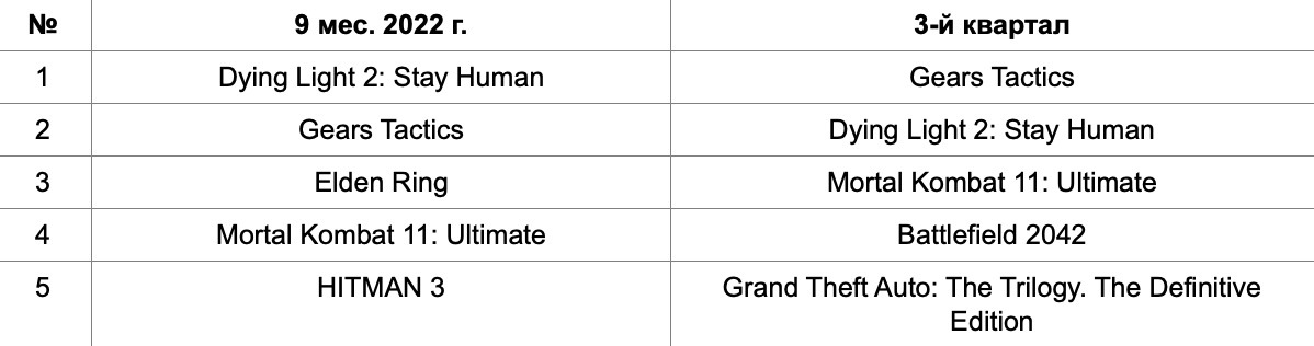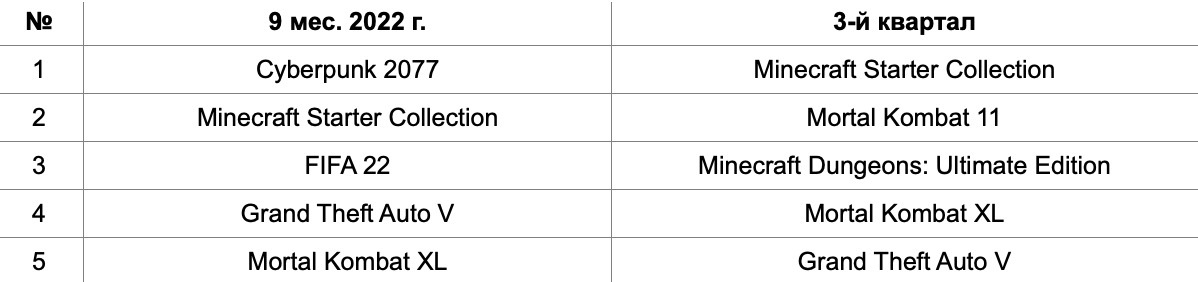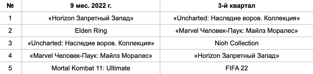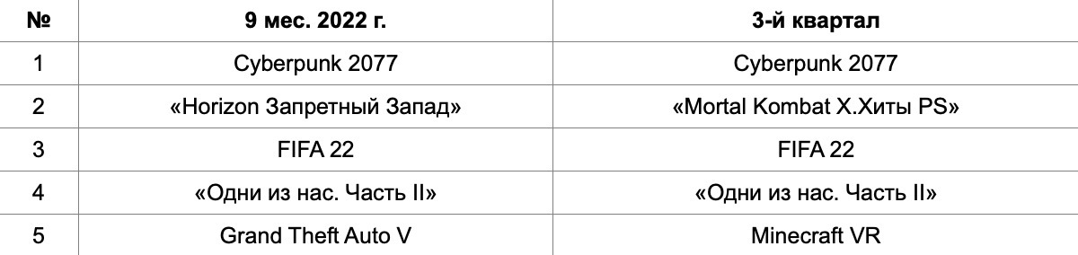 Рейтинг составлен на основе продаж за 9 месяцевНа первом месте игры для PlayStation 4, а самая продаваемая в течение года — Cyberpunk 2077, за ней шла FIFA 22. По итогам девяти месяцев вторую строчку занял эксклюзив «Horizon Запретный Запад», а в третьем квартале — «Mortal Kombat X. Хиты PS».