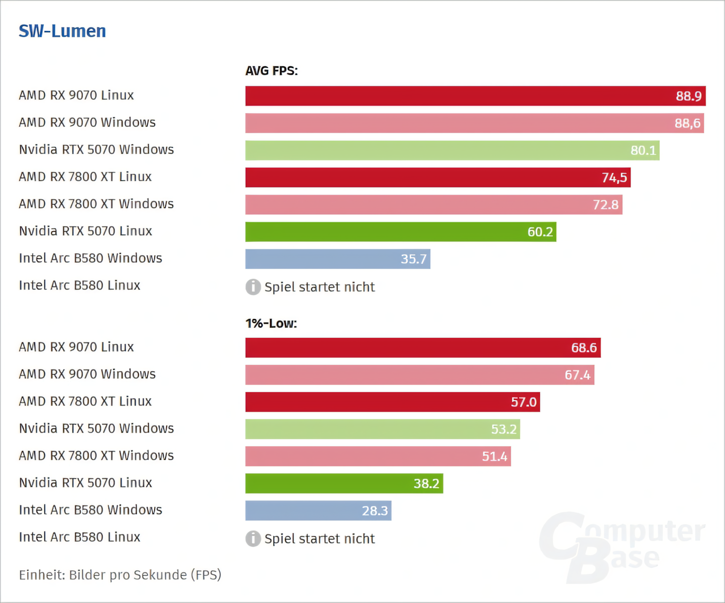 На Radeon RX 9070 и RX 7800 XT Linux показал чуть более высокие средние fps и существенно лучшие показатели по нижнему порогу (1%-Low). К примеру, RX 7800 XT выдает в Linux 74,5 fps против 72,8 на Windows. Это делает игровой процесс заметно плавнее.