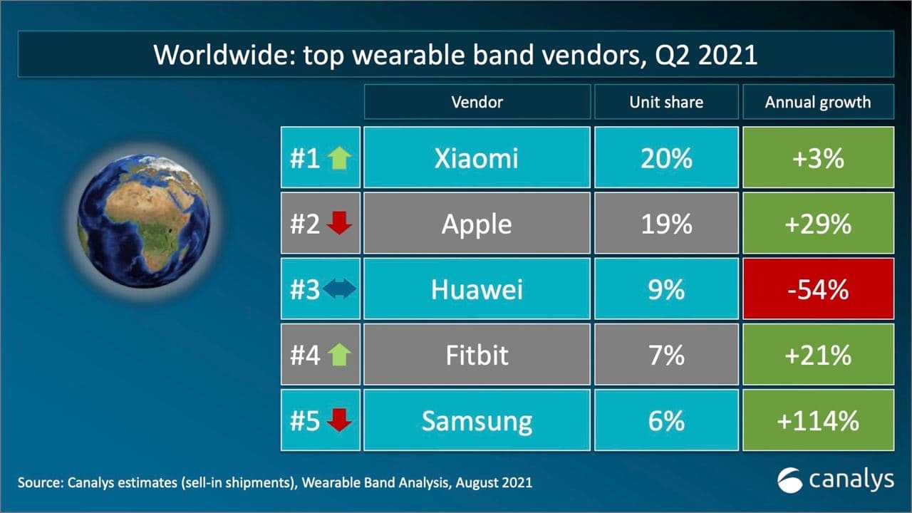 Снова лидирует XiaomiАналитическое агентство Canalys представило отчёт за второй квартал 2021 года, согласно которому компания Xiaomi заняла первое, лидирующее, место и оторвалась от других производителей на 25%. Xiaomi снова лидирует в нише доступных носимых устройств. Как отмечается, на мировом рынке компании составила 20%, а объём отгрузок вырос на 3%.