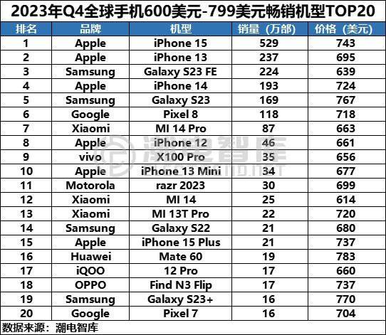 Первые пять мест разделили Apple и SamsungКитайская аналитическая компания Chaodian представила отчёт, в котором обозначены самые продаваемые в мире смартфоны в ценовом диапазоне $600-800. Отчёт представлен за четвёртый квартал 2023 года.