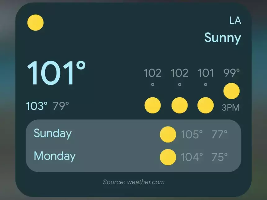 По крайней мере на телефонах PixelС середины этой недели на Юго-Западе США установилась рекордная жара со 100-градусной температурой. При проверке приложения Pixel Weather стало ясно, что погодный виджет не был разработан должным образом для отображения температуры выше 100.