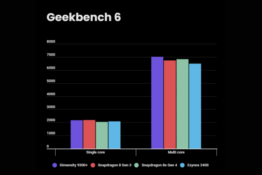 В AnTuTu чипсет набрал 1 958 675 баллов, включая 454 781 балл для процессора, 793 456 баллов для графического процессора и 414 662 балла для памяти. В Geekbench 6 Dimensity 9300 Plus продемонстрировал «впечатляющую производительность»: устройство получило 2168 баллов в одноядерном тесте и 7017 — в многоядерном.