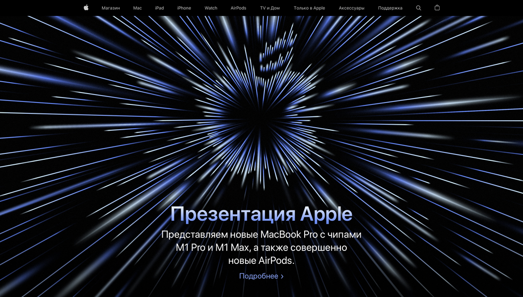 Так, если зайти на американский apple.com, можно увидеть анонс сегодняшний презентации. Но как только мы переходим на русскую версию сайта, перед нами предстаёт ретроспектива осенней презентации компании. Это та, на которой Apple представила новые 14- и 16-дюймовые MacBook Pro на чипах M1 Pro и M1 Max.
