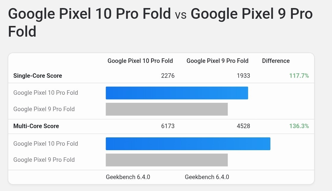 Тесты проводились на Pixel 10 Pro Fold. В одноядерном режиме Tensor G5 набрал 2276 баллов, в многоядерном — 6175. Это не только явный прирост по сравнению с прошлым поколением, но и небольшое преимущество над Snapdragon 8 Gen 3 от Qualcomm.