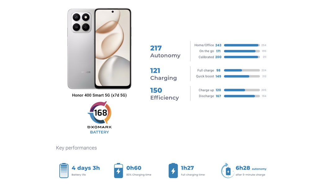 Дополнительную роль сыграли HD+ дисплеи, снижающие энергопотребление. По данным DxOMark, HONOR X7d проработал 4 дня и 13 часов без подзарядки, а HONOR 400 Smart 5G — около 4 дней и 3 часов.