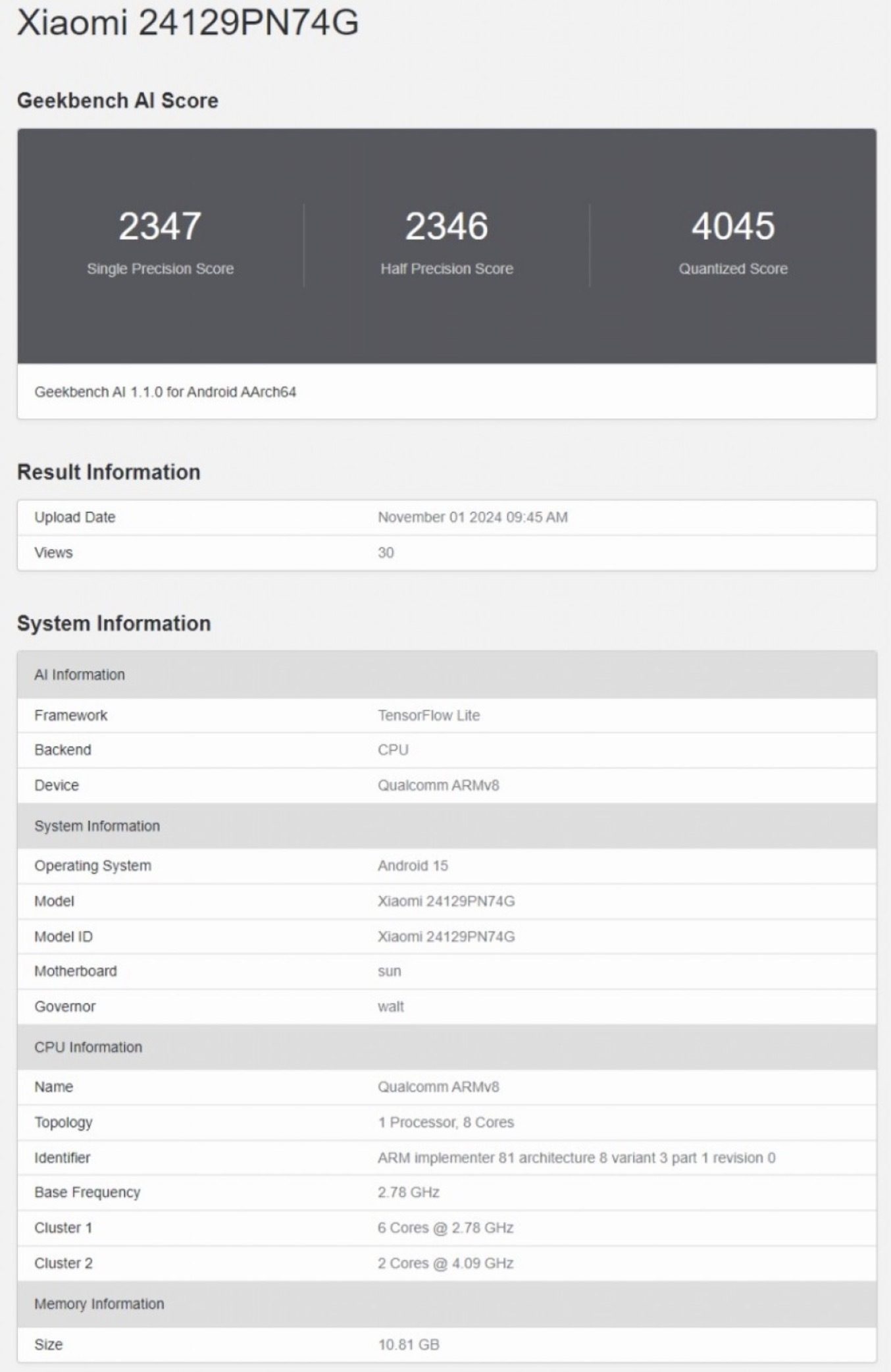 Geekbench опубликовал результаты тестирования ИИ в глобальной версии Xiaomi 15